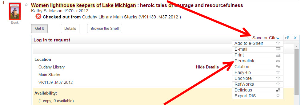 Click on the Save or Cite link to show a list of options for saving and citing an item from the catalog.